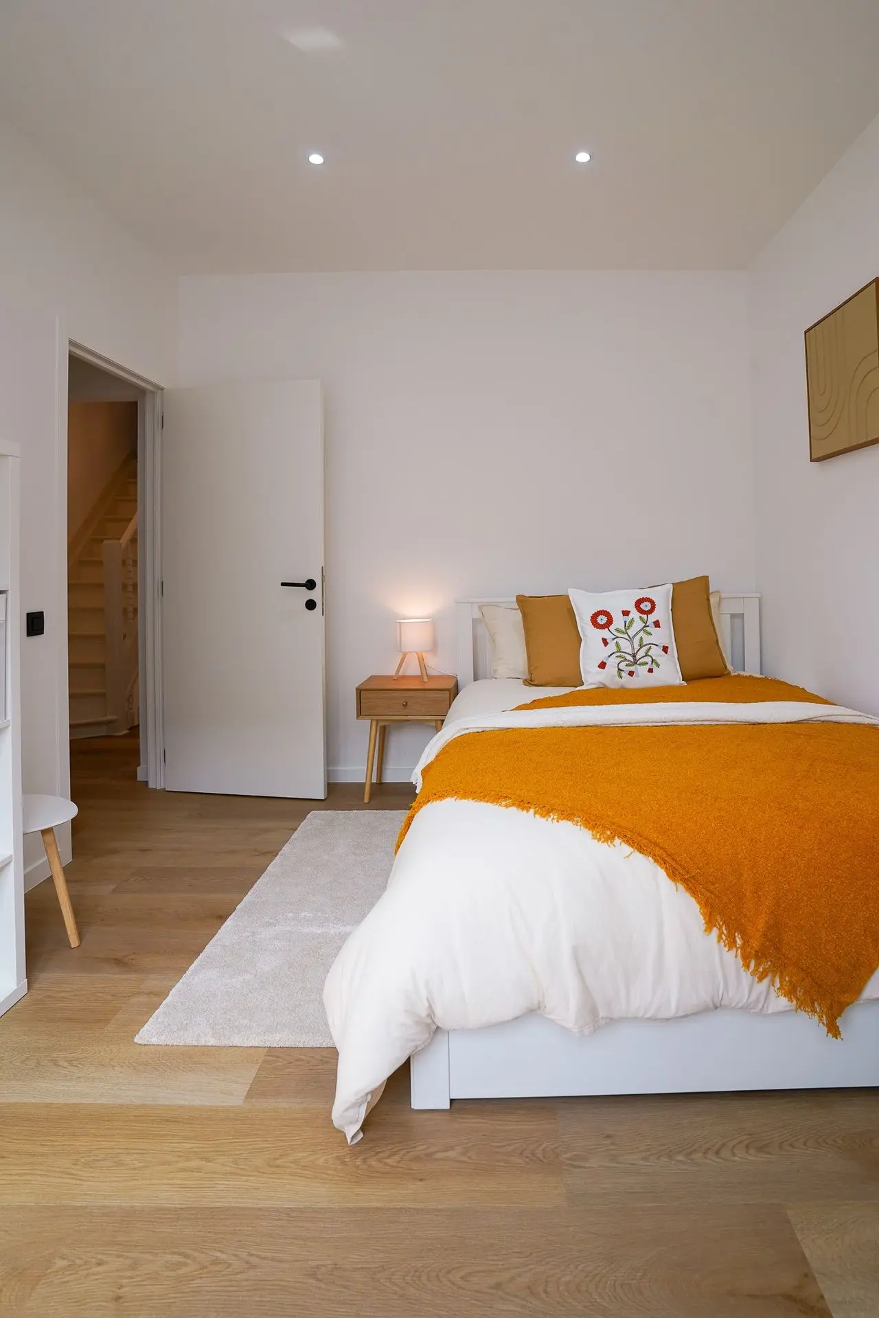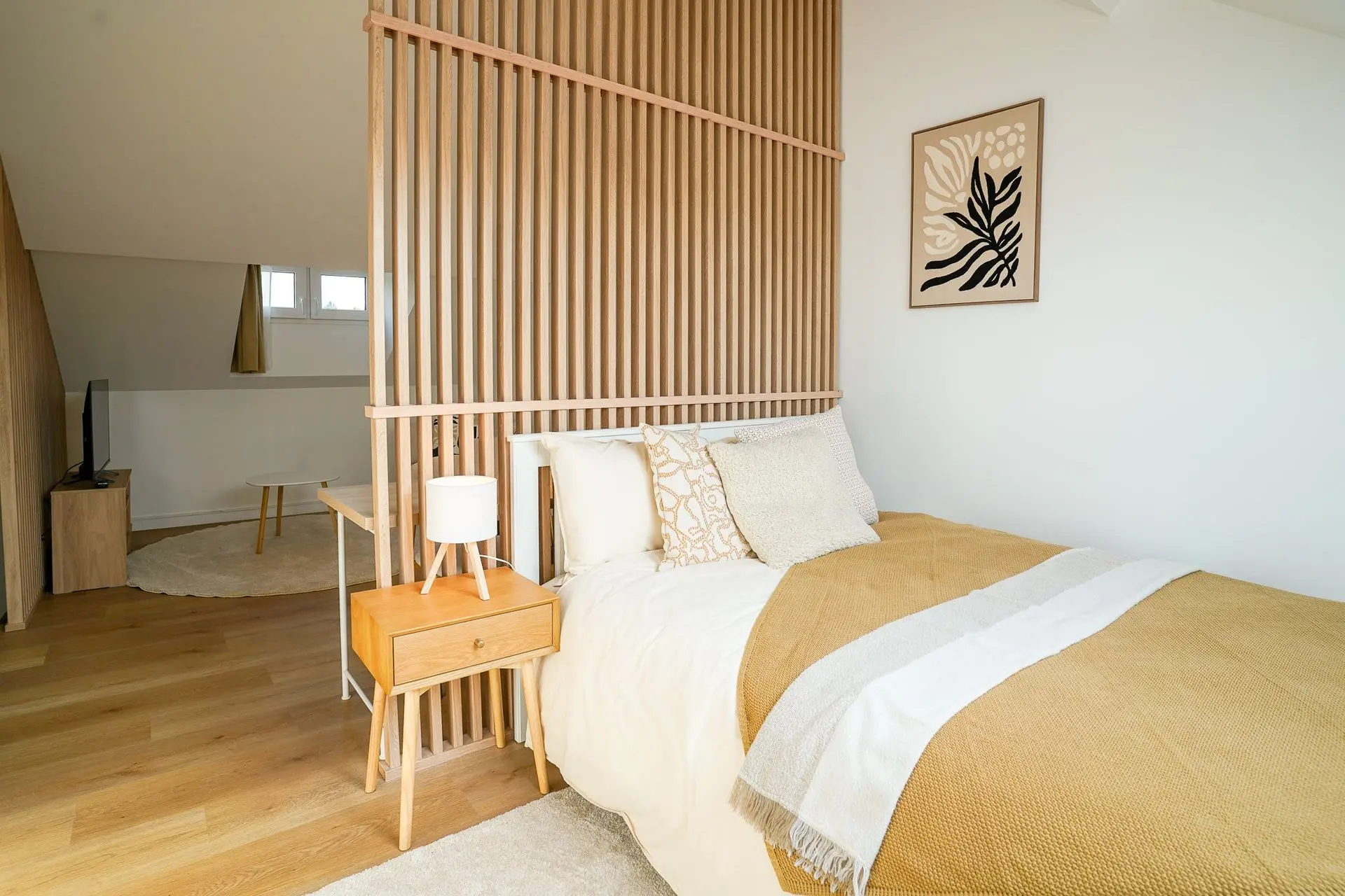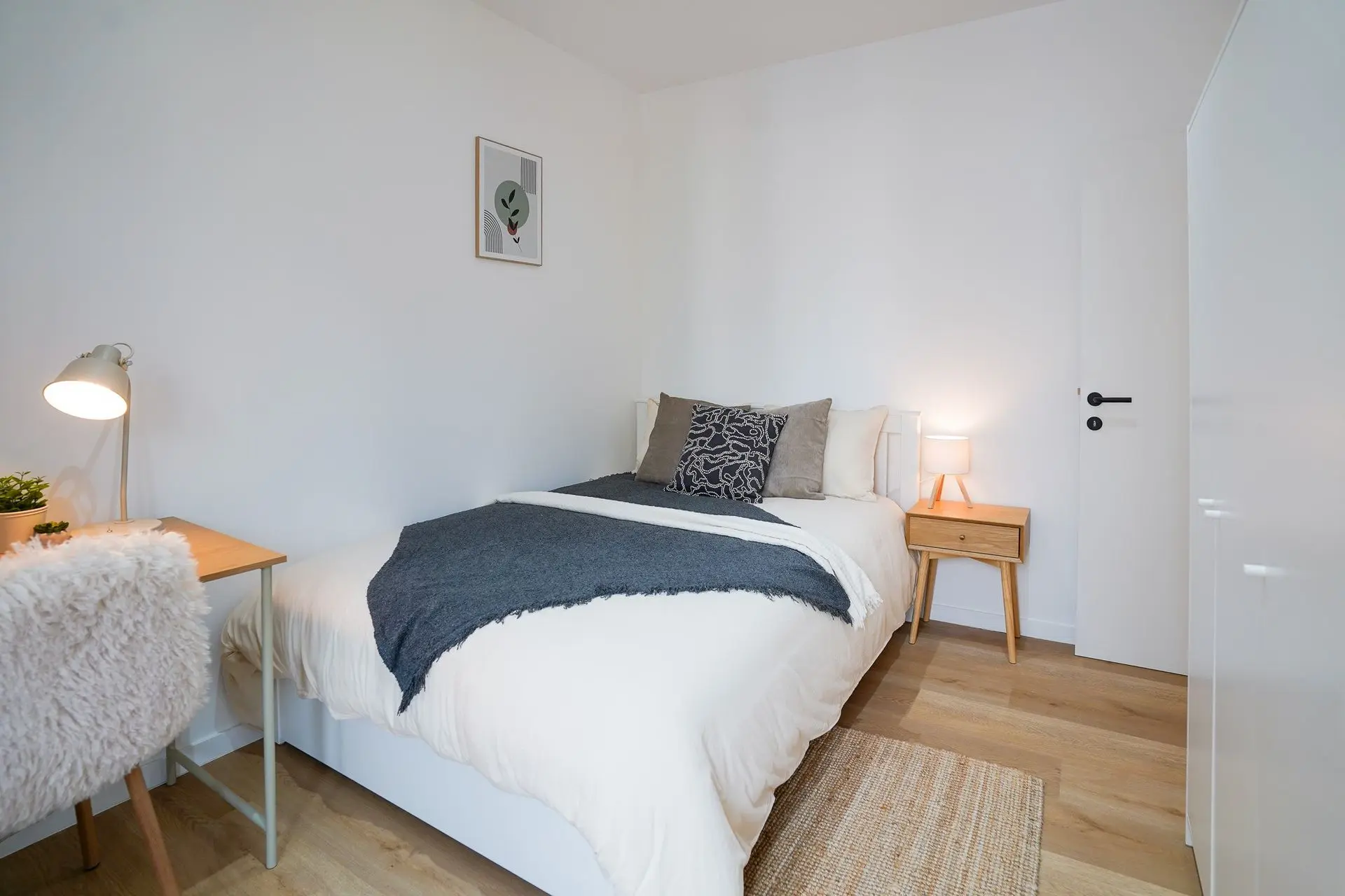 Ce projet consistait à meubler une maison de 6 chambres entièrement rénovée, destinée à la colocation. Nous avons créer une ambiance chaleureuse et familiale, afin que chaque habitants s'y sente comme chez lui. Chaque chambre doit contenir un lit, une armoire, un bureau, une tv. Quand cela est possible (et grâce à une aménagement optimisé), nous intégrons un coin lecture/fauteuil ou bien un coin salon/canapé, augmentant ainsi la valeur et le confort de la chambre. Une chambre aménagée dans les combles a été aménagée afin de créer un espace salon, un espace bureau/kitchenette grâce à la mise en place de claustras bois.